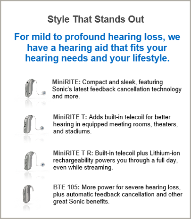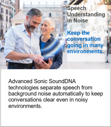 Building upon their Speech Variable Processing and SoundDNA platforms, Sonic’s products use binaural technology to create natural sounds that dynamically adjust to your changing environment. Wireless connectivity makes wearing a Sonic hearing aid a pleasure.